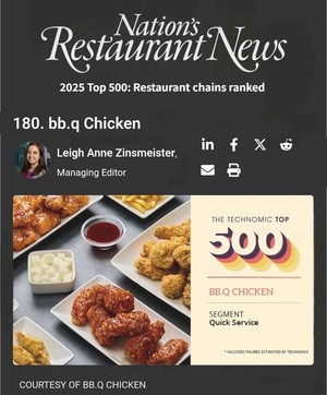 프랜차이즈의 본고장인 미국에서 BBQ가 외식 브랜드 순위에서 200위 안에 진입했다. 제너시스BBQ 그룹(회장 윤홍근)은 미국 외식 전문 매체 네이션스 레스토랑 뉴스(Nation’s Restaurant News, 이하 NRN)가 발표한 ‘2025 미국 외식 프랜차이즈 브랜드 TOP 500’ 순위에서 4년 연속 상승하며 180위까지 올랐다고 20일 밝혔다.NRN의 ‘TOP 500’은 미국 외식 산업 내 브랜드의 연간 매출, 매장 수, 성장률 등을 종합적으로 분석해 발표되며, 미국 외식 프랜차이즈 업계 전반에서 가장 공신력 있는 브랜드