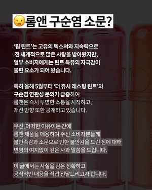 롬앤, 구순염 논란…소비자 신뢰 흔들리다“롬앤 틴트를 바른 뒤 입술이 붓고 통증이 생겼다”는 게시물이 SNS와 뷰티 커뮤니티를 중심으로 퍼지면서, 국내 대표 색조 브랜드 롬앤이 예상치 못한 위기에 직면했다. 문제의 핵심은 단순한 사용 불편을 넘어 제품 안전성 논란으로 확대되고 있다는 점이다. 립 메이크업 제품에서 발색이나 지속력만큼 중요한 요소는 바로 안전성이다. 소비자들이 제품을 믿고 사용할 수 있어야 하는데, 이번 논란으로 신뢰에 금이 간 셈이다. 논란은 몇몇 사용자의 경험담에서 촉발됐다. 틴트를 바른 후 입술이 따갑거나 붓고,